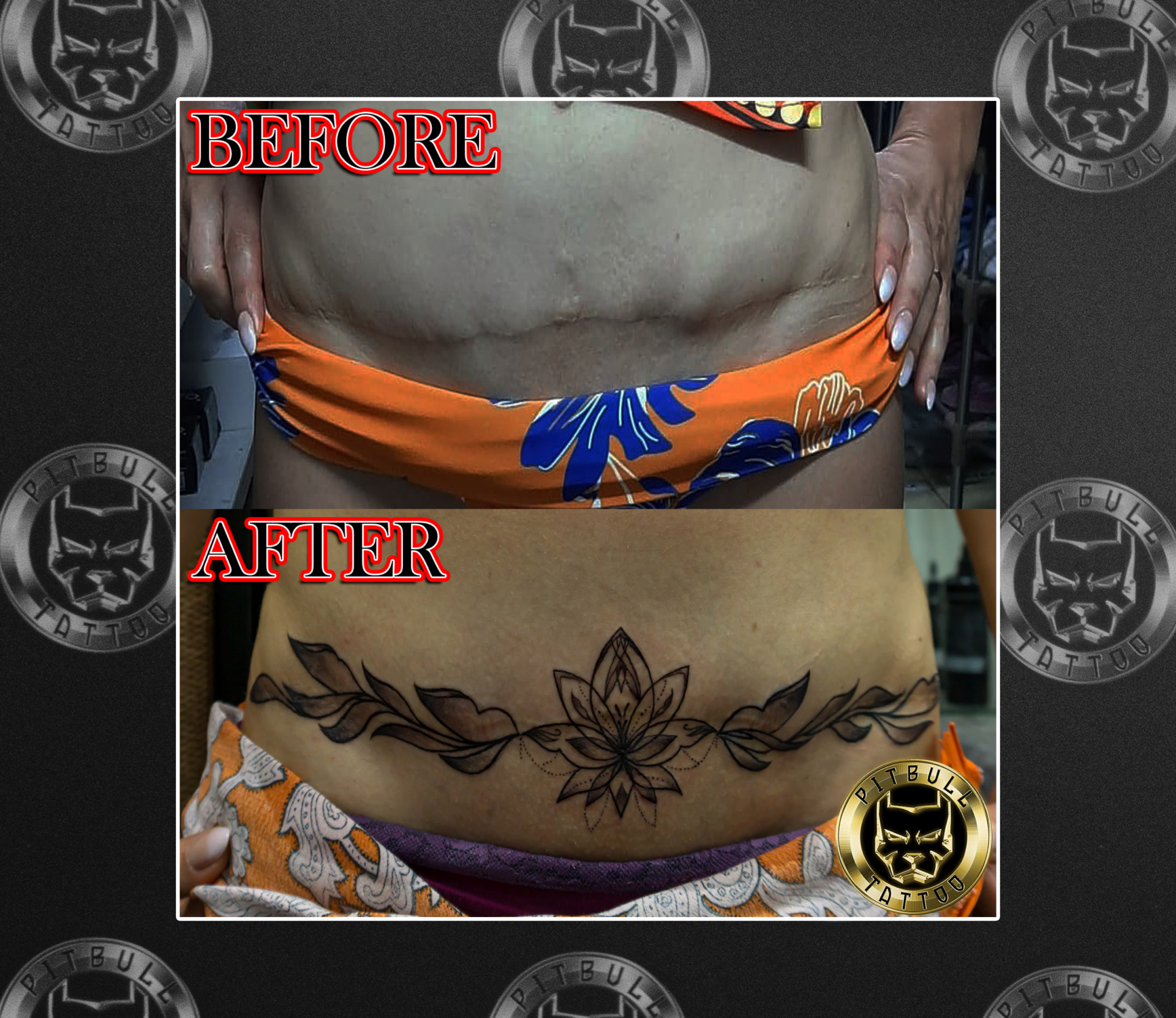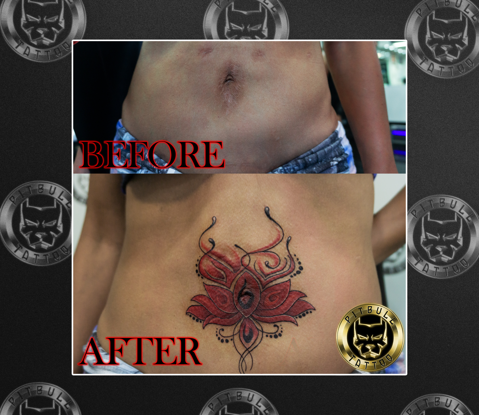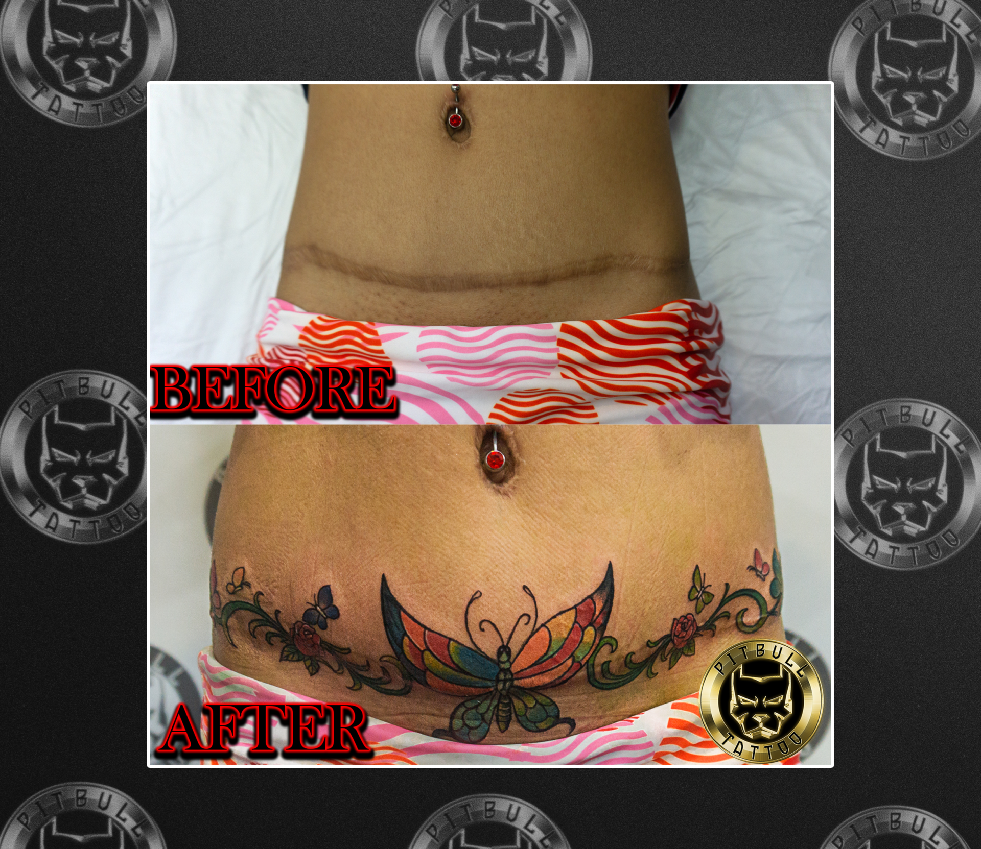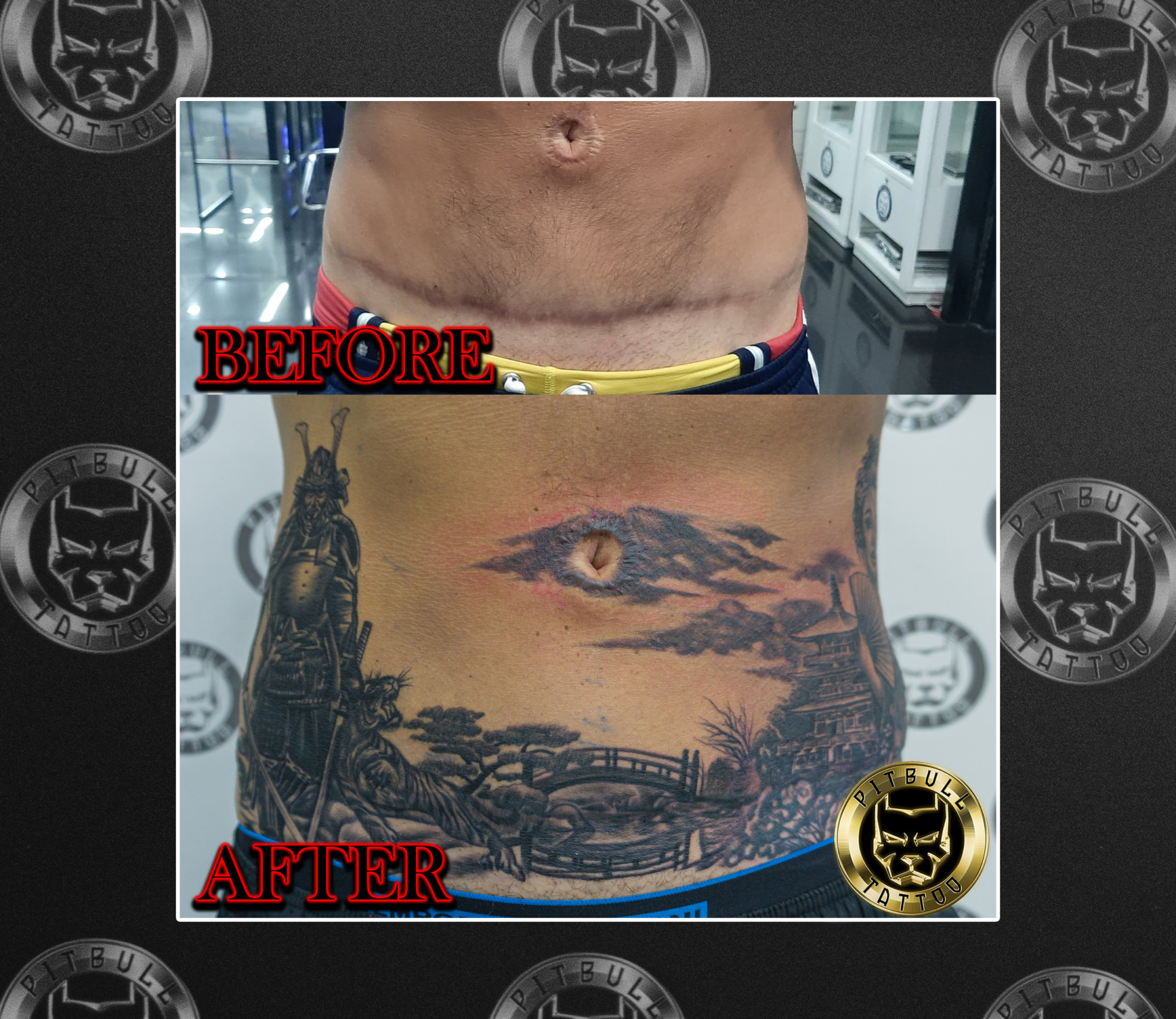 Tattoo over a scar is not hard with the right tattoo artist to give you consultation and perform the task. Scar tissue is different from the regular skin tissue, and often has different texture and level. Our tattoo artists have the skillset to accommodate the tattoo you desire on any kind of scars. We will provide you with over scar tattoo that you will be confident to display in public and put a smile on your face every time you see it. Check out some of our happy customers who had over scar tattoo below.