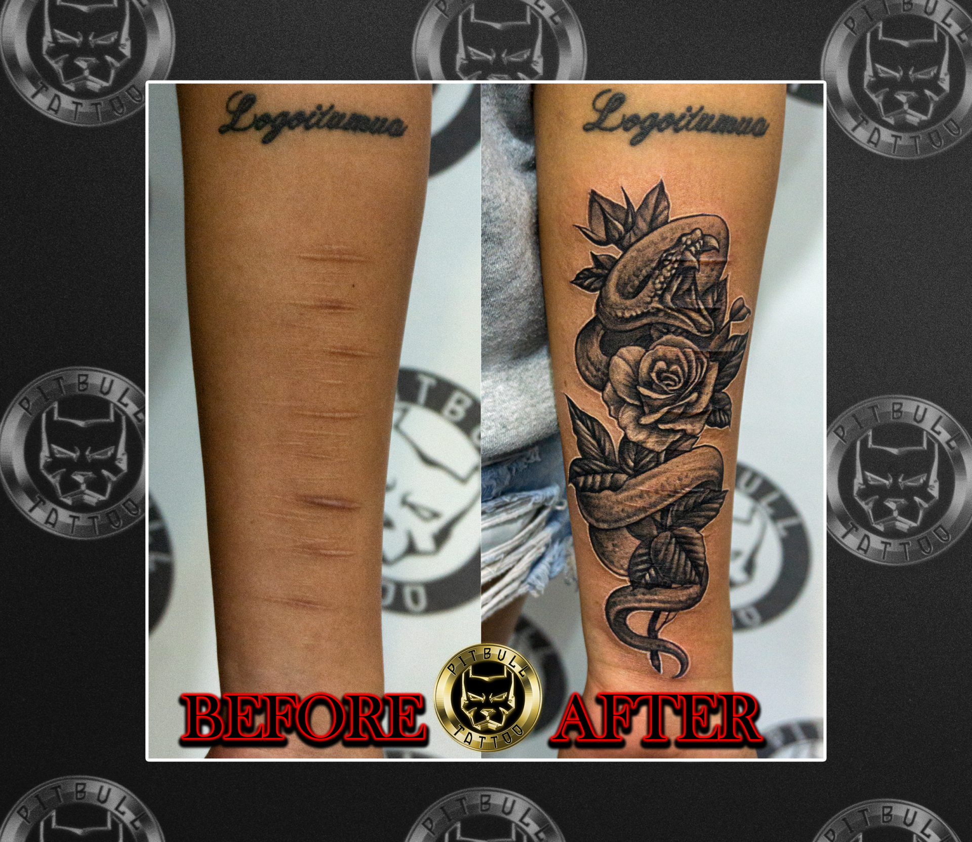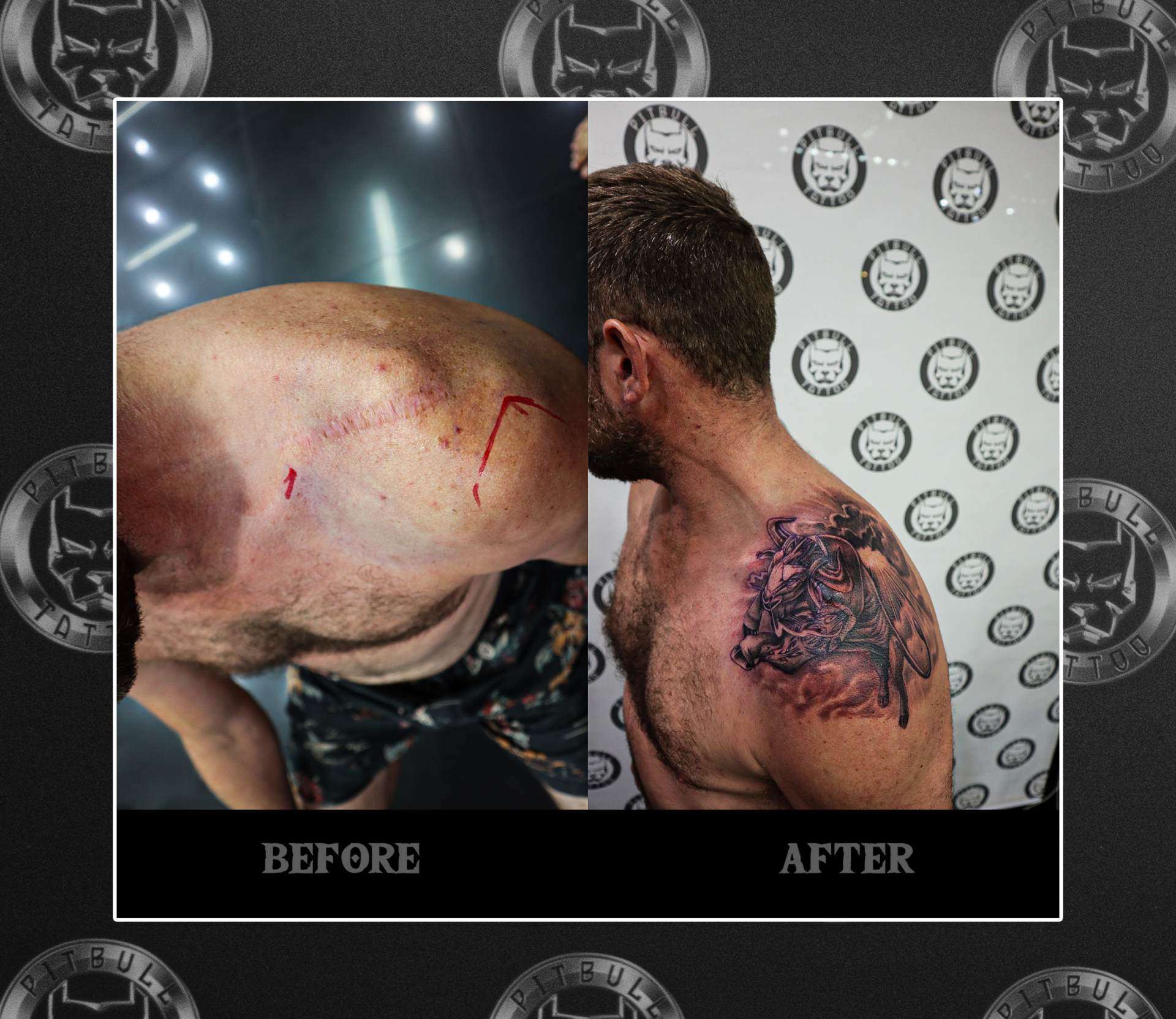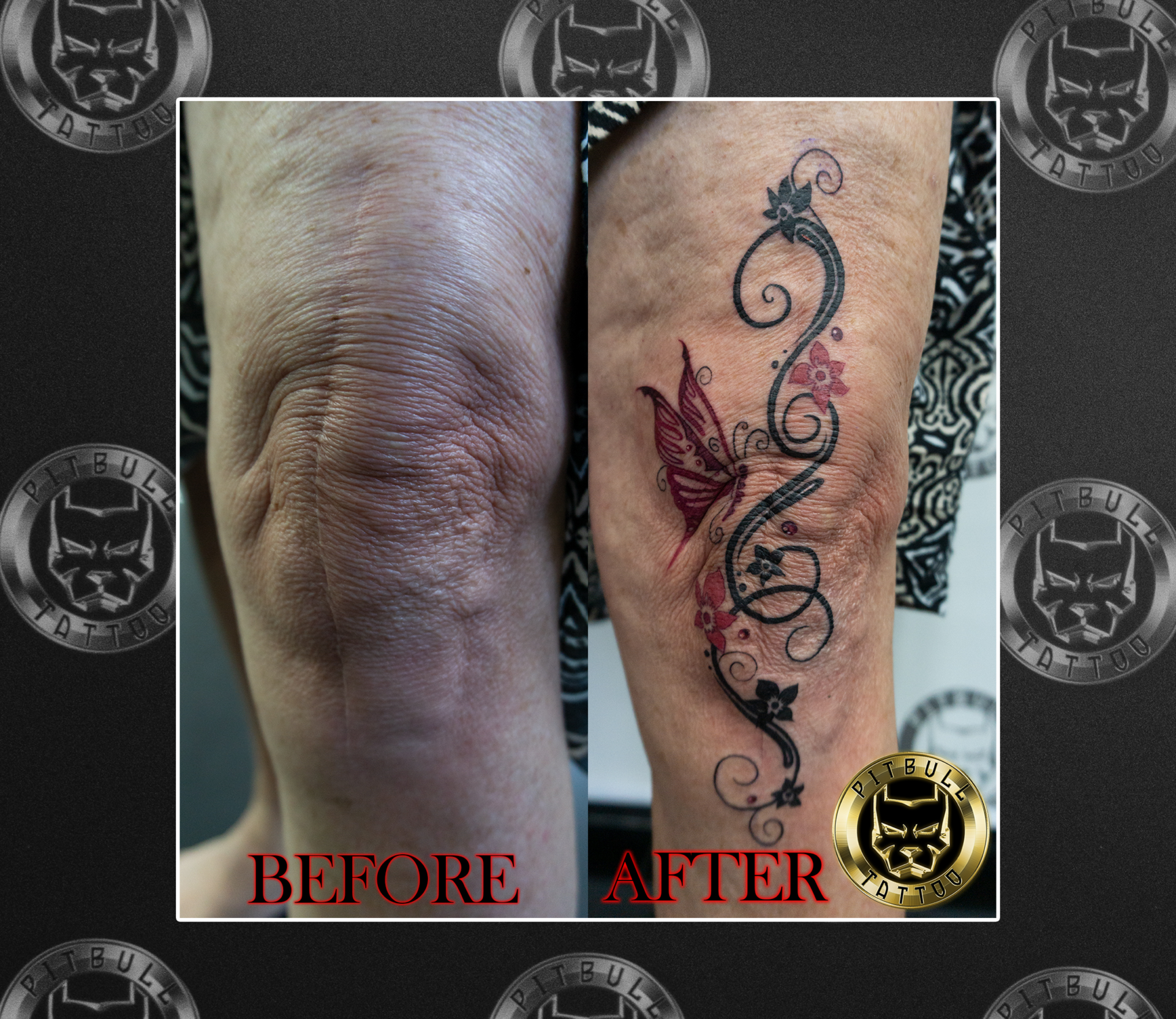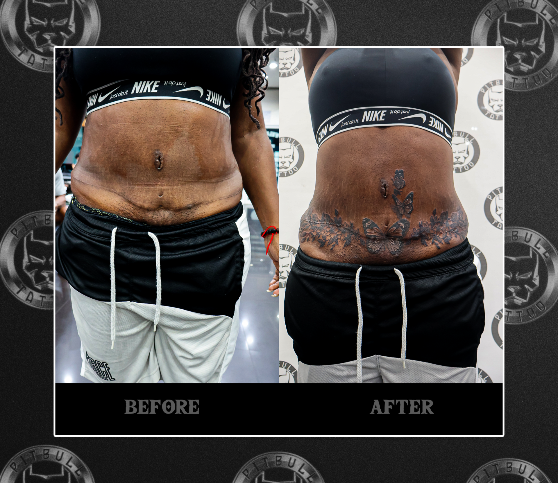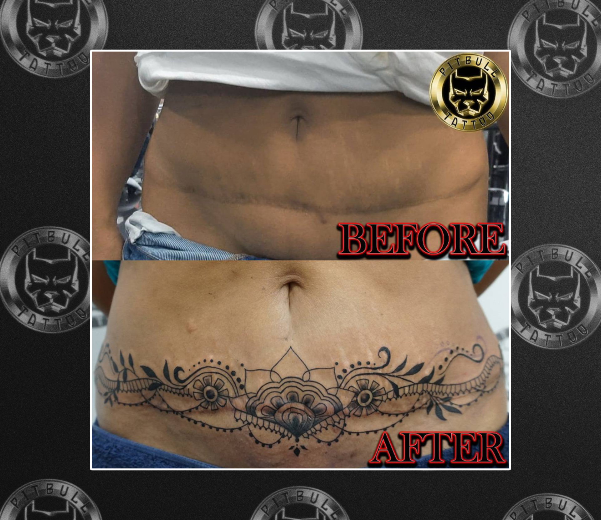 Tattoo over a scar is not hard with the right tattoo artist to give you consultation and perform the task. Scar tissue is different from the regular skin tissue, and often has different texture and level. Our tattoo artists have the skillset to accommodate the tattoo you desire on any kind of scars. We will provide you with over scar tattoo that you will be confident to display in public and put a smile on your face every time you see it. Check out some of our happy customers who had over scar tattoo below.